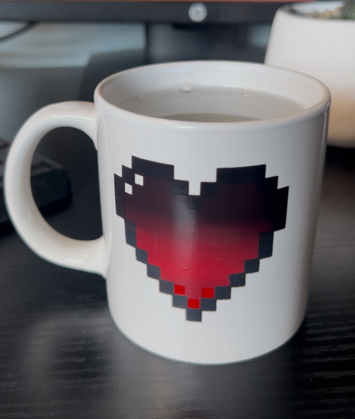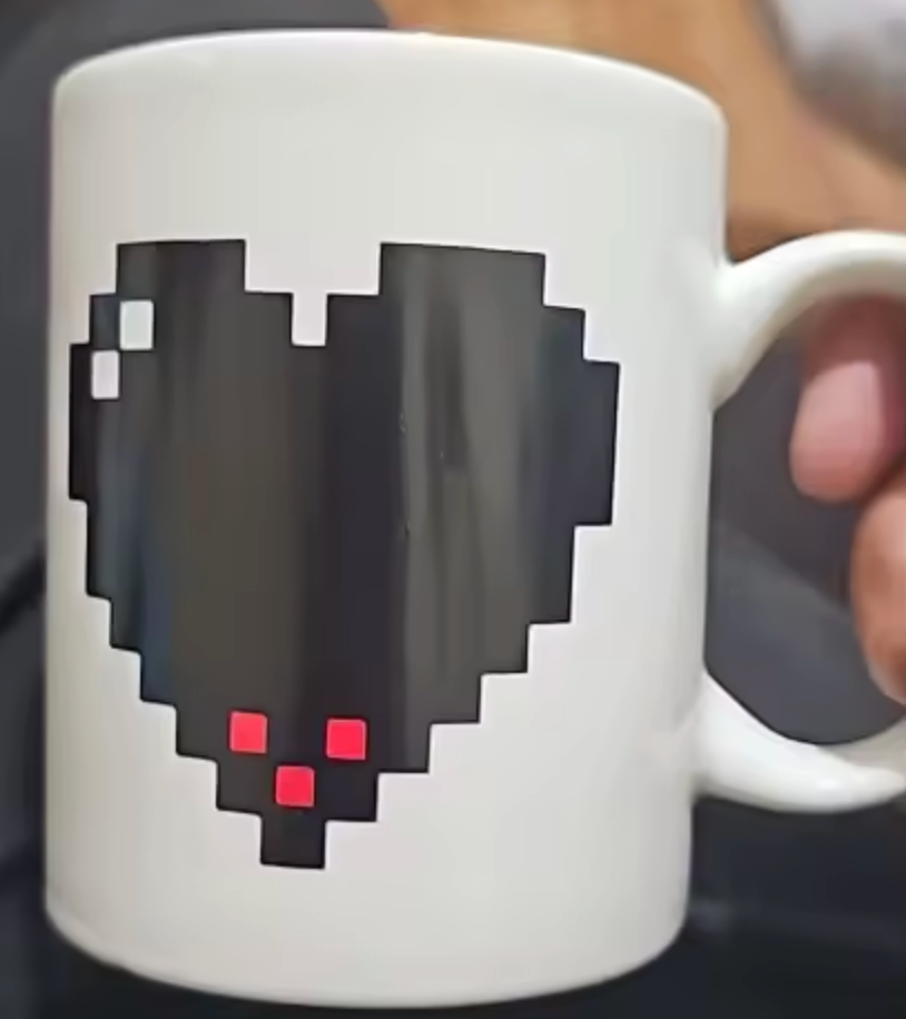 When you pour in a hot drink, the mug’s heat-reactive coating activates, revealing the design as the temperature rises. As it cools, the design fades back.